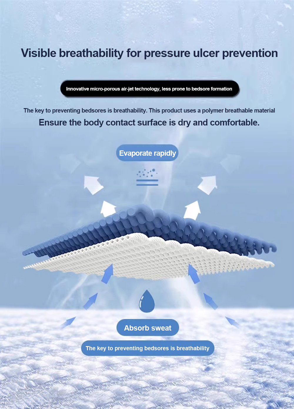 A: "它专门设计为 医用防褥疮床垫 用于预防和处理医院和护理场所的压疮(褥疮)。交替的气室不断重新分配压力"。